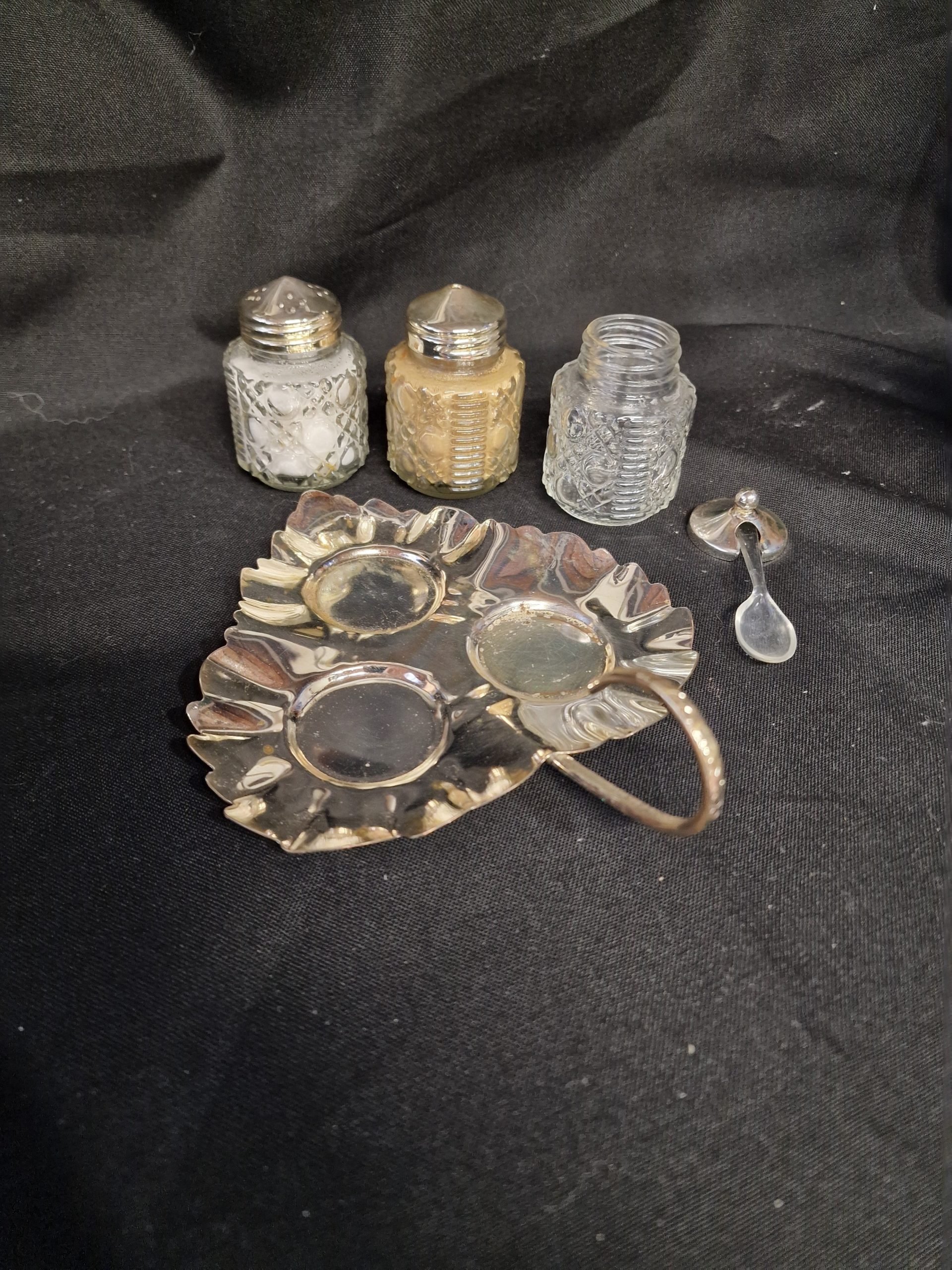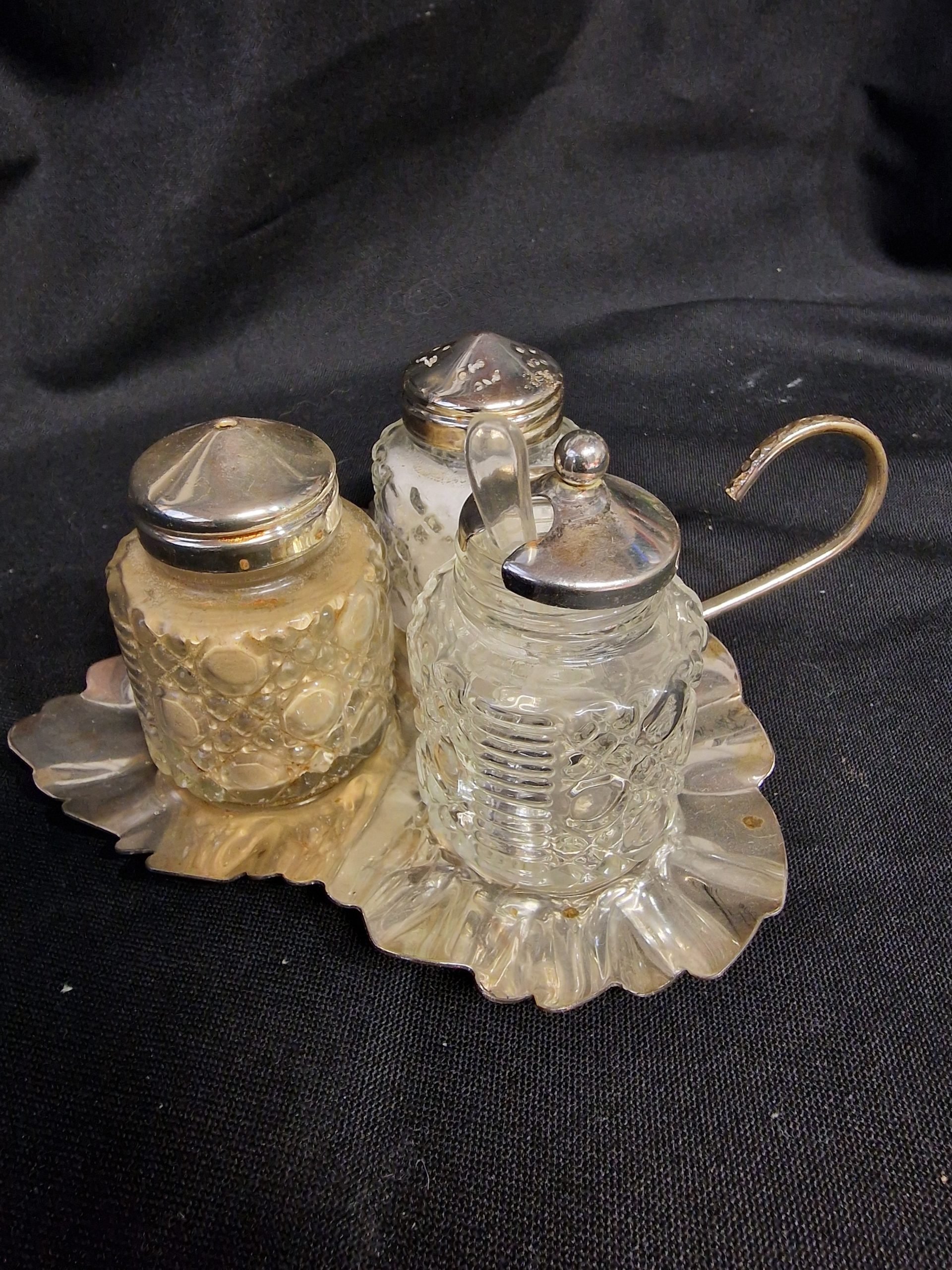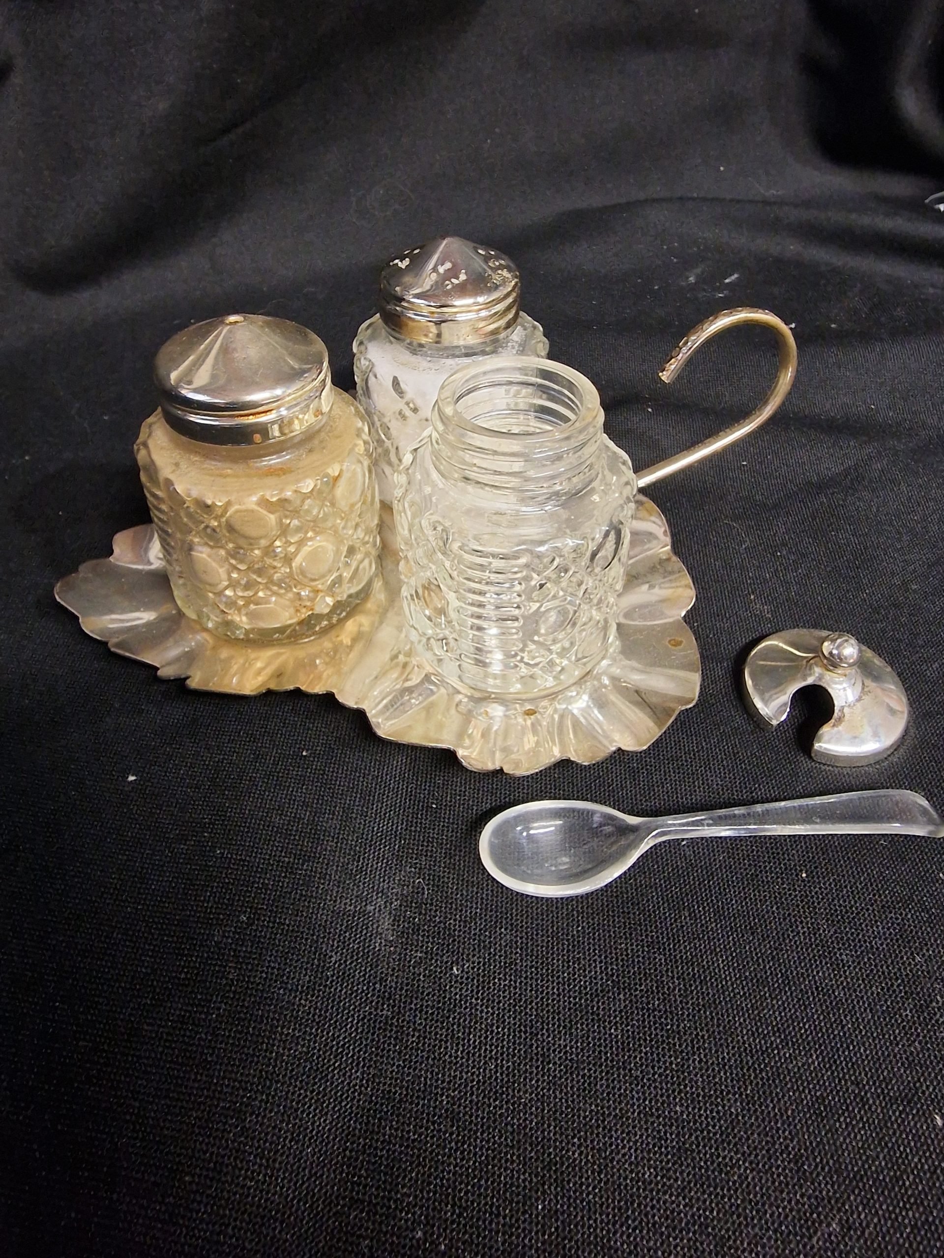 Verzilverd Engels ménage setje met lichte gebruikssporen.