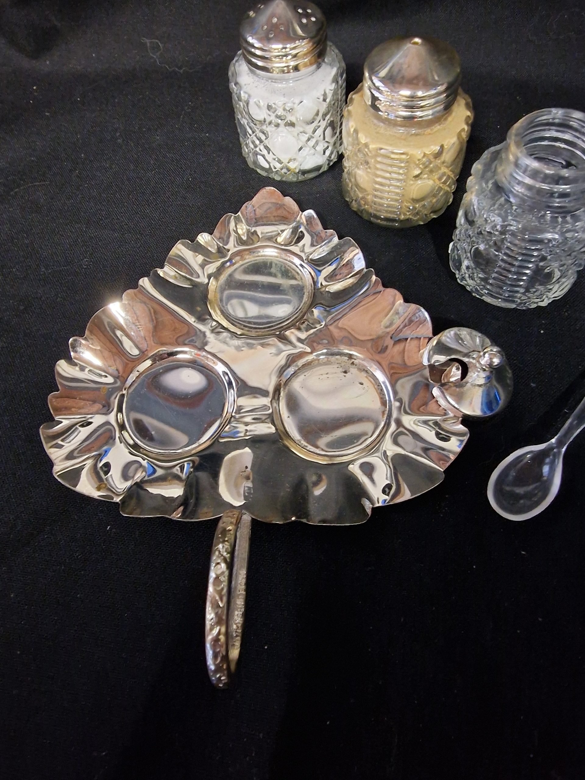 Set bestaat uit verzilverd blad en een pepervaatje, zoutvaatje en mosterdsoep met lepeltje.